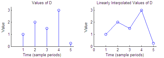 Например, если входной сигнал D = [1 2 1,5 3 0,25] ', график слева показывает выборки в D, а график справа показывает линейно интерполированные значения между выборками в D.