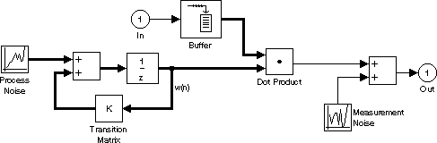 Значок блока имеет метки портов, соответствующие входам и выходам алгоритма Калмана. Следует отметить, что входы в порты In и Err должны быть скалярами на основе выборки с одинаковой сложностью. Сигнал в порту Out является скалярным, в то время как сигнал в порту Taps является вектором на основе выборки.