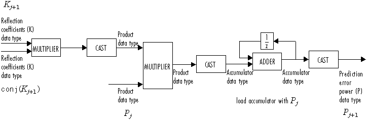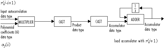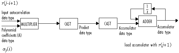 Диаграммы в этом разделе показывают типы данных, используемые в блоке Левинсона-Дурбина для сигналов с фиксированной точкой.