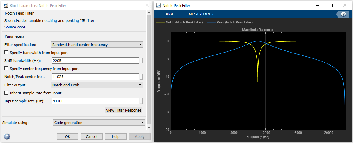 Блок фильтра пробка-пик фильтрует каждый канал входного сигнала во времени с использованием заданной центральной частоты и полосы пропускания 3 дБ. Этот блок содержит настраиваемые параметры конструкции фильтра, которые позволяют настраивать характеристики фильтра во время выполнения моделирования.