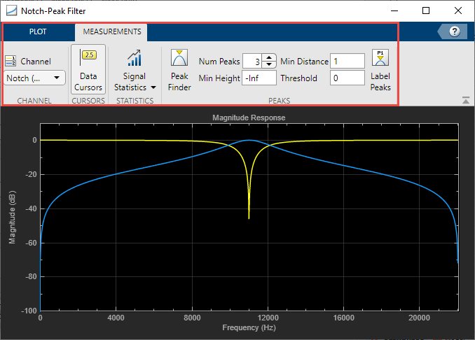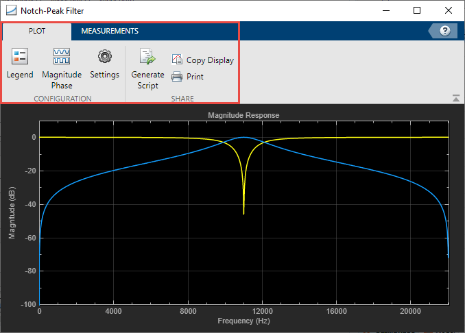 Открывает визуализатор динамического фильтра и отображает амплитудную характеристику фильтра с пиковыми отметками. Ответ основан на параметрах, выбранных в диалоговом окне «Параметры блока». Чтобы обновить отклик величины во время работы визуализатора динамического фильтра, измените параметры в диалоговом окне и нажмите кнопку «Применить».