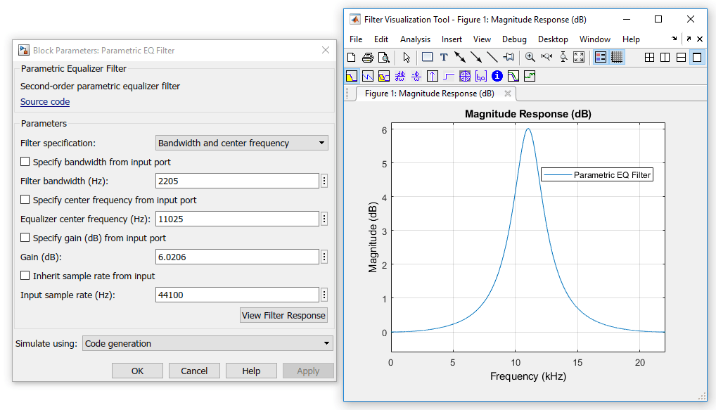 Открывает инструмент визуализации фильтра FVTool и отображает отклик величины/фазы параметрического EQ-фильтра. Ответ основан на параметрах диалогового окна блока. Изменения, внесенные в эти параметры, обновляют FVTool.