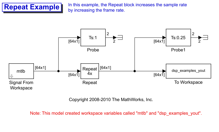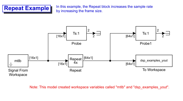 В модели ex_repeat_ref1 блок повтора выполняет повторную выборку одноканального входа с периодом кадра 1 секунда. Блок повторяет входные значения для увеличения входного значения на коэффициент 4. Таким образом, выходной сигнал блока имеет период кадра 0,25 секунды. Размеры входного и выходного кадров идентичны.