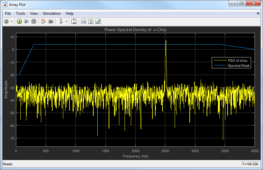 Блок оценки спектра оценивает PSD чирпа. В этом примере данные PSD сравниваются со спектральной маской. Блок «Отображение» показывает 1 или 0, в зависимости от того, находятся ли спектральные данные в маске или нет. Во время моделирования можно изменить мощность входного сигнала, перемещая ползунок в блоке усиления ползунка. Одновременно это изменение можно просмотреть в блоке «Печать массива».