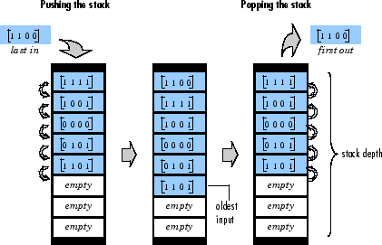 Блок стека хранит последовательность входных выборок в последнем входном регистре (LIFO). Емкость регистра задается параметром глубины стека, а входами могут быть скаляры, векторы или матрицы.