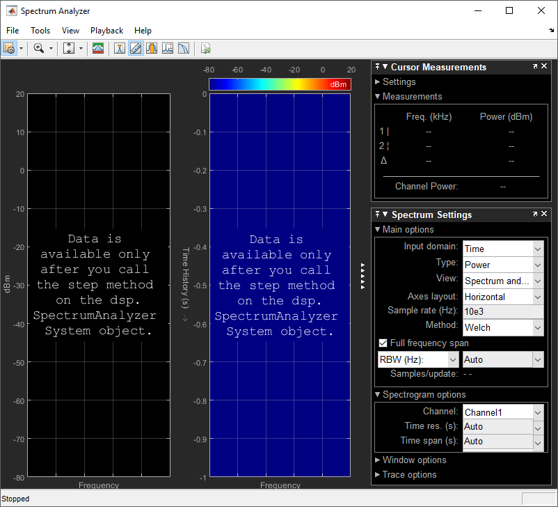 % Creation Code for 'dsp.SpectrumAnalyzer'. % Generated by Spectrum Analyzer on 10-Mar-2019 16:25:49 -0500. specScope = dsp.SpectrumAnalyzer('ViewType','Spectrum and spectrogram', ... 'AxesLayout','Horizontal'); % Cursor Measurements Configuration specScope.CursorMeasurements.Enable = true;