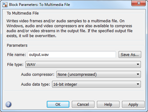 Блок To Multimedia File записывает видеокадры, аудиоотсчеты или оба в мультимедиа (.avi, .wav, .wma, .mp4, .ogg, .flac, or .wmv) файл.