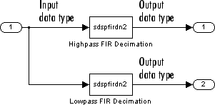 Блок банка фильтров поддиапазонов двухканального анализа состоит из двух блоков децимации КИХ, как показано на следующей диаграмме.
