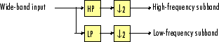 Блок фильтра поддиапазонов двухканального анализа разлагает входной сигнал на высокочастотный и низкочастотный поддиапазоны, каждый из которых имеет половину полосы пропускания и половину частоты дискретизации входного сигнала.