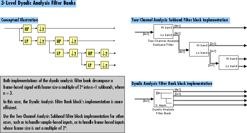 Блок Diadic Analysis Filter Bank позволяет задавать фильтры банка фильтров, предоставляя векторы коэффициентов фильтра, как это делает этот блок. Блок банка фильтров диадического анализа предоставляет дополнительную возможность использования фильтров на основе вейвлетов, которые блок проектирует с помощью указанного вейвлета.