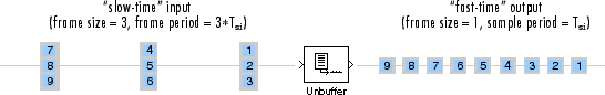Блок Unbuffer распаковывает входной сигнал Mi-by-N в 1-by-N выход. То есть, входные данные не являются буферизированными по строкам, так что каждая строка матрицы становится независимой временной выборкой на выходе. Скорость, с которой блок принимает входные сигналы, обычно меньше скорости, с которой блок выдает выходные сигналы.