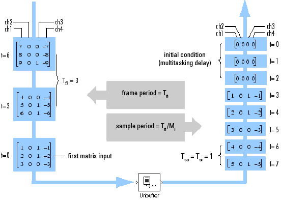 Для многозадачности буфер блока Unbuffer инициализируется значением, заданным параметром Initial conditions, и блок начинает разуплотнять этот кадр в начале моделирования. Следовательно, входы в блок задерживаются на одну длину буфера или отсчеты Mi.