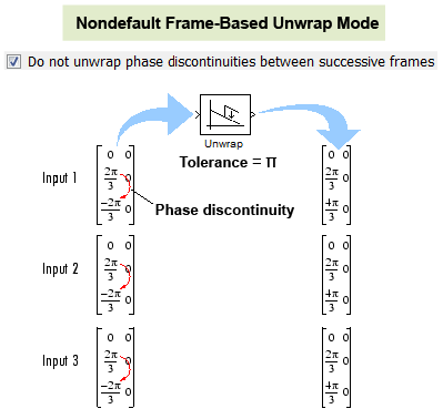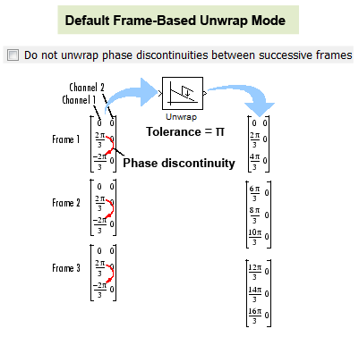 yout((i+1),:)=u(i+1)+(2*pi*k); % add 2*pi*k to the last element of the inputПри конфигурировании блока для выполнения обработки на основе кадров установите для параметра Input processing значение Columns as channels (frame based), блок поддерживает два различных режима восстановления. В обоих режимах блок добавляет к элементам каждого входного канала по 2,.dk и обновляет k при каждом разрыве фазы. Разница между этими двумя режимами заключается в том, как часто блок сбрасывает начальное значение фазы (k) до нуля. Можно развернуть данные через границы кадра (по умолчанию) или только внутри входных кадров путем сброса начального значения фазы при каждом получении нового входного кадра.