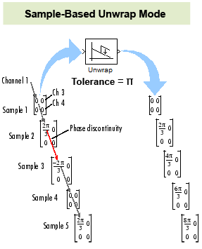 Блок Unwrap разворачивает каждый канал своей входной матрицы или входного вектора, добавляя 2οk к каждому последовательному элементу канала и обновляя k при каждом переходе фазы. Фазовый переход происходит, когда разность между двумя соседними записями значений фазы превышает значение параметра Tolerance.