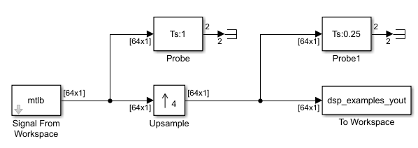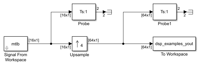 В модели ex_upsample_ref2 блок Upsample выполняет повторную выборку одноканального входа с размером кадра 16. Блок увеличивает входной сигнал в 4 раза. Таким образом, выходной сигнал блока имеет размер кадра 64. Поскольку блок находится в режиме односкоростной обработки, частота входных и выходных кадров идентична.