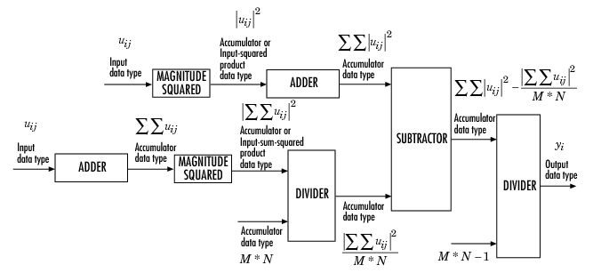 Когда этот блок вычисляет дисперсию по всему входному сигналу, результат идентичен вызову var функция как y = var(u(:)).