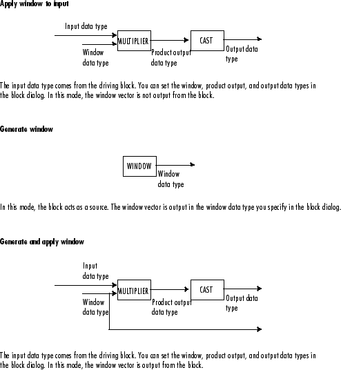 В этом режиме блок генерирует вектор окна M-by-1 w и применяет его к входу. Блок выдает два выхода: