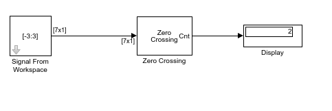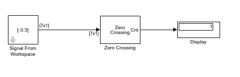 Поскольку сигнал проходит через нуль один раз в течение первого временного шага, блок пересечения нуля находит одно пересечение нуля. Количество обнаруженных пересечений нулей на первом шаге времени показано в блоке Display на следующем рисунке.