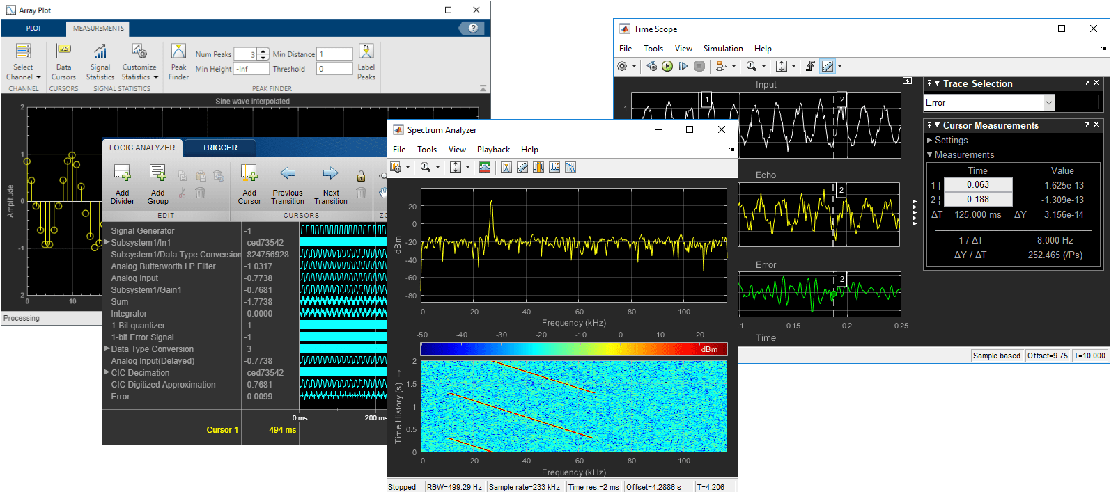 DSP Scopes визуализируют потоковые данные и данные в реальном времени с помощью аппаратных интерфейсов. Используйте измерения, курсоры, триггеры и маски для визуального контроля и анализа потоковых данных. В MATLAB ® можно визуализировать потоковые данные с помощью системных объектов области. В Simulink ® можно визуализировать сигналы с помощью блоков области или приложений или сохранить данные в MATLAB с помощью блоков «Временная область» или «В рабочую область».