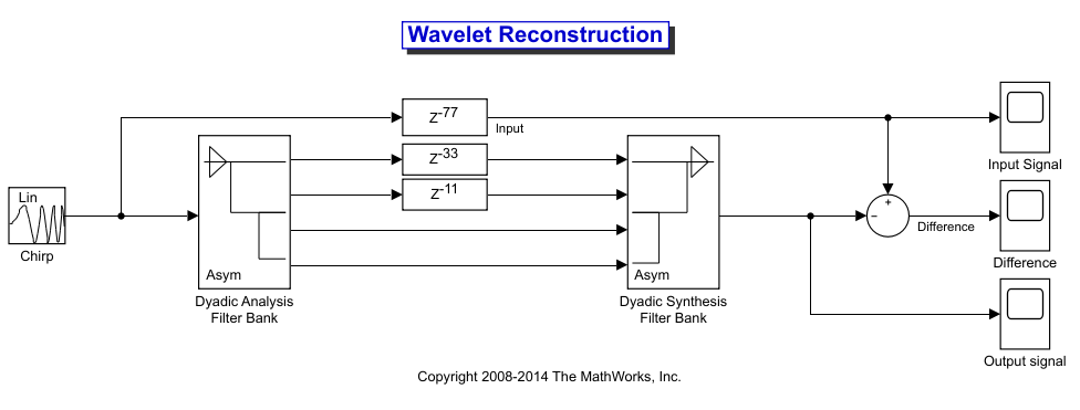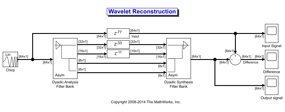 Теперь, когда вы знаете задержки, необходимые для идеальной вейвлет реконструкции, вы можете включить эти значения задержки в модель. ex_wavelets модель уже обновлена с правильными значениями задержки (M = 11, N = 33, в целом = 77), поэтому она готова к выполнению.