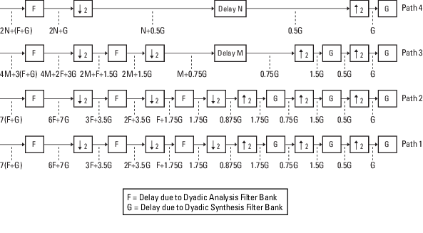 Из предыдущего рисунка видно, что задержки сигнала на трактах 1 и 2 идентичны: 7 (F + G). Поскольку каждый путь системы банка фильтров имеет идентичную задержку, можно приравнять уравнения задержки для путей 3 и 4 к уравнению задержки для путей 1 и 2. После построения этих уравнений можно решить для M и N соответственно: