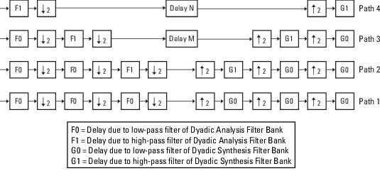 fvtool анализ на этапе 1 показал, что фильтры нижних и верхних частот банка фильтров анализа имеют одинаковую групповую задержку (F0 = F1 = 5,5). Таким образом, можно использовать F для представления групповой задержки банка фильтров анализа. Аналогично, групповая задержка низко- и высокочастотных фильтров банка фильтров синтеза одинакова (G0 = G1 = 5,5), поэтому можно использовать G для представления групповой задержки банка фильтров синтеза.