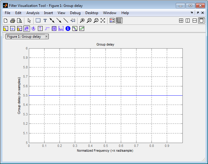 После создания фильтров в рабочей области MATLAB можно использовать fvtool для определения групповой задержки фильтров. Для анализа низкочастотного биорогонального фильтра, используемого блоком банка фильтров Dyadic Analysis, необходимо выполнить следующие действия: