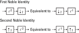 Можно применить идентификаторы Noble, суммируя задержку на каждом пути сигнала справа налево. Первый идентификатор Noble указывает, что перемещение задержки 1 перед понижением 2 эквивалентно умножению этого значения задержки на 2. Аналогично, вторая идентичность Noble указывает, что перемещение задержки 2 перед увеличением 2 эквивалентно делению этого значения задержки на 2.