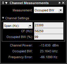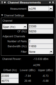 На панели Channel Measurements отображаются измерения занятой полосы пропускания или отношения мощности соседних каналов (ACPR).