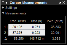 На панели «Измерения» отображаются измерения частоты (Гц), времени (времени) и мощности (дБм). Время отображается только в режиме спектрограммы. Мощность канала показывает общую мощность между курсорами.