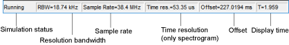 Анализатор спектра показывает параметры вычисления спектра для текущей визуализации. В строке состояния области для получения этой информации установите флажки Разрешающая полоса пропускания, Временное разрешение и Смещение. Значения, указанные этими индикаторами, могут изменяться в зависимости от настроек на панели «Параметры спектра». Можно также просмотреть статус моделирования и количество временных данных, соответствующих текущему отображению. Проверьте состояние моделирования и индикаторы времени отображения для этой информации.