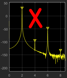 Чтобы просмотреть наилучшие гармоники, убедитесь, что основная частота задана достаточно высокой для разрешения гармоник. Однако эта частота не должна быть настолько высокой, чтобы происходило наложение псевдонимов. Для наилучшего отображения гармонических искажений ваш график не должен показывать юбки, которые указывают на утечку частоты. Также должен быть виден шумовой пол.