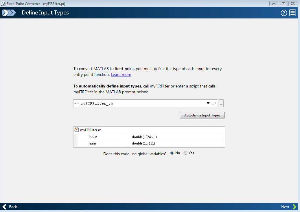 На странице Определить типы ввода (Define Input Types), чтобы добавить myFIRFilter_tb в качестве тестового файла перейдите к myFIRFilter_tb.mи нажмите кнопку Автоопределить типы ввода.