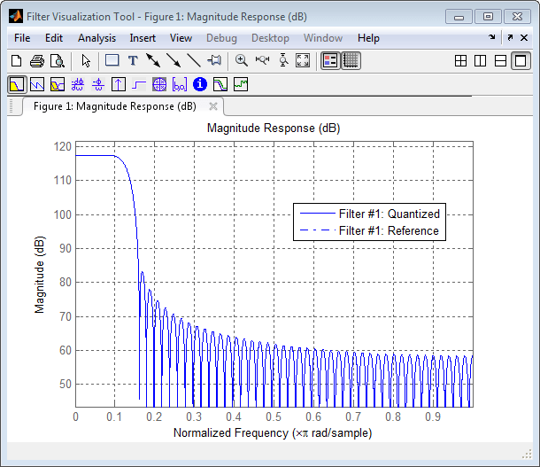 specifyall(h); h.OutputWordLength = 16; h.OutputFracLength = -14; yout2 = filter(h, xsc);