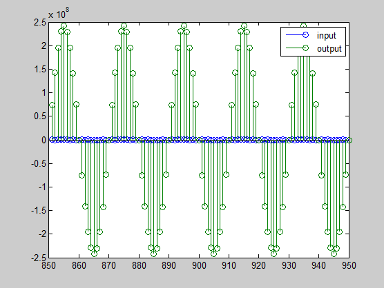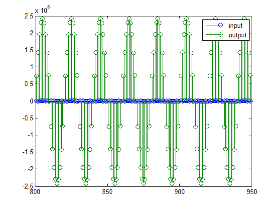 На графике также показано, что входные и выходные данные находятся в разных масштабах. Чтобы масштабировать выходной сигнал так, чтобы можно было легче сравнивать сигналы на графике, необходимо соответствующим образом взвесить MSB. Можно вычислить новую длину дроби, используя коэффициент усиления фильтра, когда коэффициенты были целыми числами: