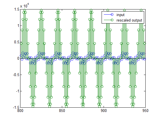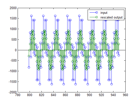 Здесь ysc является выводом полной точности, означающим, что никакие биты не были отброшены в вычислениях. Это делает ysc наилучший выход, который можно получить, учитывая 12-разрядный вход и 18-разрядные коэффициенты. Это можно проверить с помощью фильтрации с двойной точностью с плавающей запятой и сравнения результатов двух операций фильтрации: