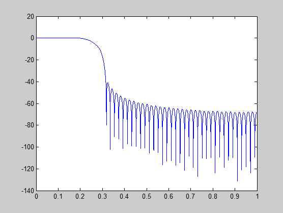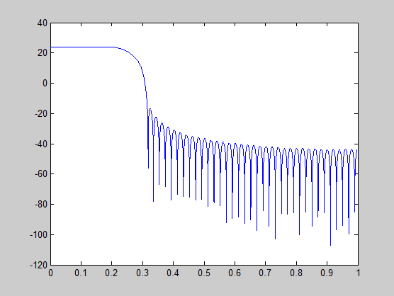 [H,w] = freqz(h); plot(w/pi, 20*log10(2^(-18)*abs(H)));