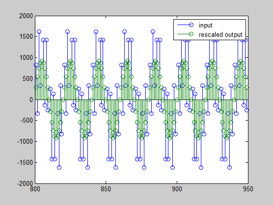 Этот график показывает, что выходной сигнал по-прежнему больше входного. Если бы вы сделали фильтрацию с двойной точностью с плавающей запятой, это было бы не так - потому что здесь для выхода используется больше битов, чем для входа, поэтому MSB взвешиваются по-разному. Вы можете увидеть этот другой способ, глядя на амплитудную характеристику масштабированного фильтра: