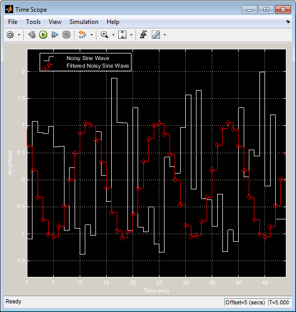 Если окно «Область времени» не открыто, дважды щелкните значок блока в окне ex_timescope_tut модель. Запуск моделирования модели. В окне «Область времени» на панели инструментов моделирования нажмите кнопку «Выполнить»