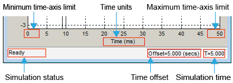 Если параметр Смещение отображения времени (Time display offset) является скаляром, значение минимального предела оси времени равно смещению отображения времени (Time display offset). Кроме того, значение максимального предела времени - оси равно сумме параметра смещения отображения времени и параметра интервала времени. Для получения информации о других параметрах в окне Область времени (Time Scope) см. справочную страницу Область времени (Time Scope).
