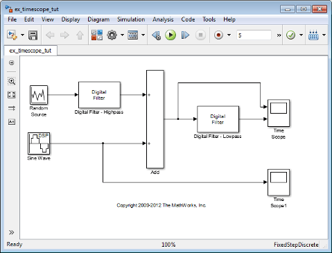 В следующем учебном пособии показано, как настроить блоки временной области в ex_timescope_tut модель для отображения сигналов временной области. Чтобы начать работу с этим учебным пособием, откройте модель, введя