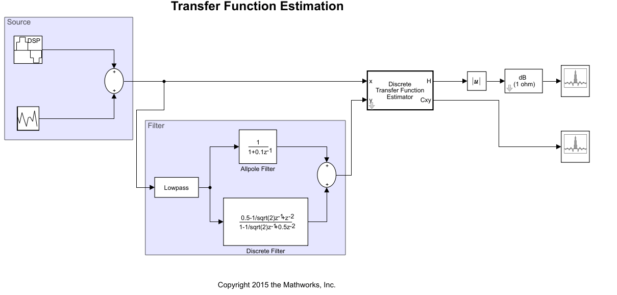 Блок оценки передаточной функции принимает два сигнала: вход в двухкаскадный фильтр и выход двухкаскадного фильтра. Вход в фильтр представляет собой синусоидальную волну, содержащую аддитивный белый гауссов шум. Шум имеет среднее значение, равное нулю, и стандартное отклонение, равное 0,1. Оценщик оценивает передаточную функцию двухступенчатого фильтра. Выходом оценщика является частотная характеристика фильтра, которая является сложной. Чтобы извлечь часть величины этой комплексной оценки, используйте функцию abs. Чтобы преобразовать результат в дБ, примените коэффициент преобразования 20 * log10 (величина).