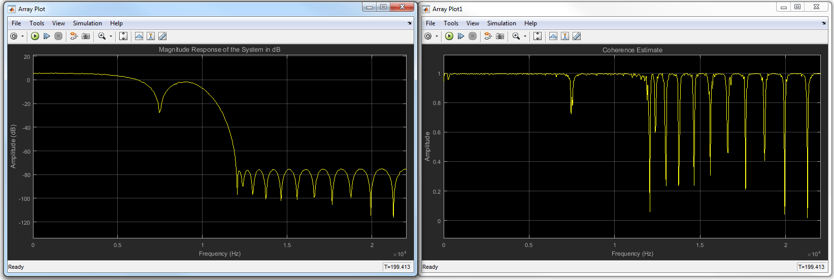 При установке OutputCoherence имущество dsp.TransferFunctionEstimator кому true, объект вычисляет выходную когерентность. В блоке «Оценка дискретной передаточной функции» для вычисления спектра когерентности установите флажок «Оценка квадратичной когерентности выходной величины».