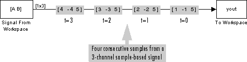 Блок «Сигнал из рабочей области» генерирует векторный сигнал для обработки на основе выборки, когда переменная или выражение в параметре Signal является матрицей, а параметр Samples per frame имеет значение 1. Каждый столбец входной матрицы представляет собой отдельный канал. Начиная с первой строки матрицы, блок выводит одну строку матрицы в каждый момент времени выборки. Поэтому, если параметр Сигнала определяет матрицу M на Н, продукция Сигнала От блока Рабочего пространства - векторы ряда 1 на Н M, представляющие N каналы.