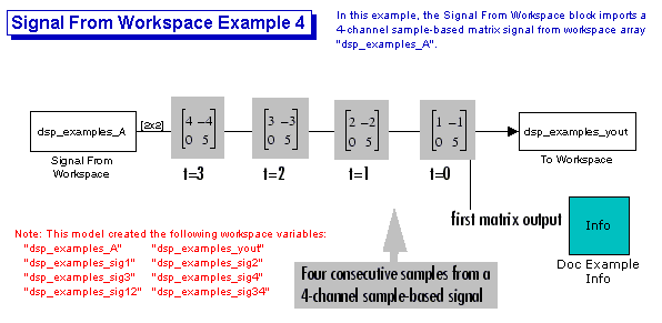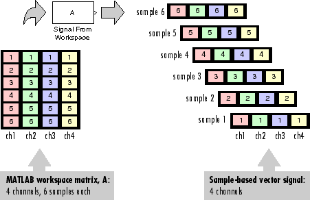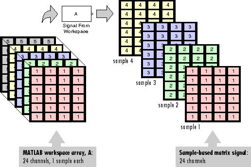 Блок «Сигнал из рабочего пространства» генерирует матричный сигнал, удобный для обработки на основе выборки. Начиная с первой страницы массива, блок выводит одну страницу массива на выход в каждый момент времени выборки. Следовательно, если параметр Signal определяет матрицу M-на-N-на-P, то выходной сигнал блока Signal From Workspace представляет собой P M-на-N матриц, представляющих M * N каналов. Блок, принимающий этот сигнал, выполняет обработку на основе выборки или обработку на основе кадра сигнала на основе параметров, заданных в диалоговом окне блока.