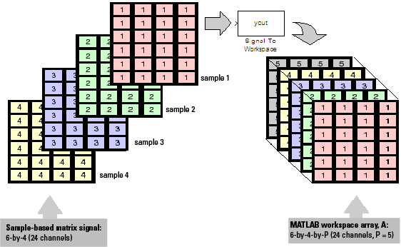 Сигнал с M * N каналами представлен в Simulink как последовательность матриц M-на-N. Когда вход в блок To Workspace является сигналом, созданным для обработки на основе выборок, блок создает массив M-by-N-by-P в рабочей области MATLAB, содержащий последние выборки P из каждого канала. Количество страниц P определяется параметром Limit data points to last. Новейшие образцы добавляются в конце массива.