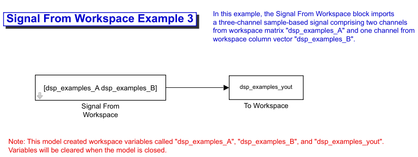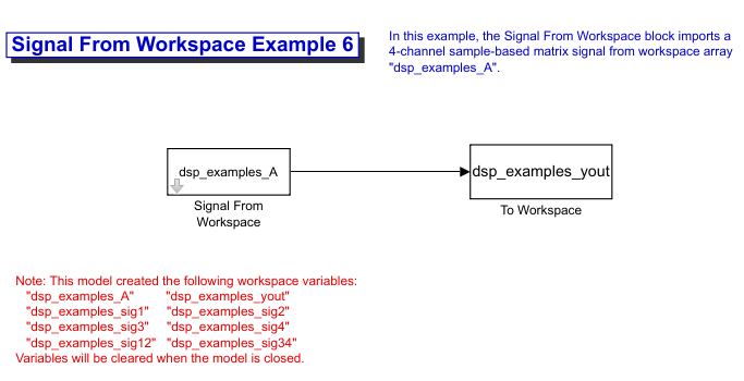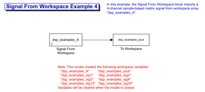 В этой модели блок «Сигнал из рабочей области» импортирует четырехканальный матричный сигнал с именем dsp_examples_A. Этот сигнал затем экспортируется в рабочую область MATLAB с помощью блока «В рабочую область».