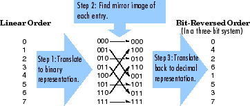 Два числа являются битово-реверсированными значениями друг друга, когда двоичное представление одного является зеркальным отображением двоичного представления другого. Например, в трехразрядной системе один и четыре являются обратными значениями битов друг друга, так как трехразрядное двоичное представление одного, 001, является зеркальным отображением трехразрядного двоичного представления четырех, 100. На приведенной ниже диаграмме частотные индексы находятся в линейном порядке. Для перевода их в битово-реверсированный порядок