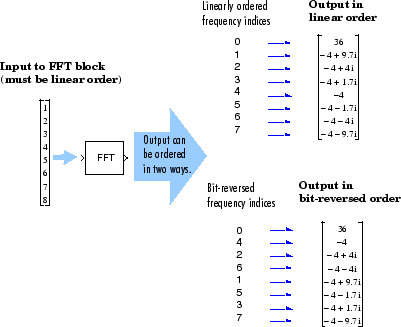 Блок БПФ позволяет выводить частотные индексы в линейном или битовом порядке. Поскольку линейное упорядочение частотных индексов требует операции обращения битов, блок БПФ может работать более быстро, когда выходные частоты находятся в обратном порядке битов.