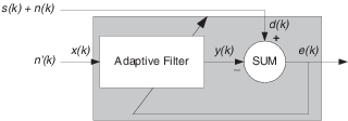 При шумоподавлении адаптивные фильтры позволяют удалять шум из сигнала в реальном времени. Здесь нужный сигнал, который нужно очистить, объединяет шум и требуемую информацию. Чтобы удалить шум, подайте сигнал n '(k) в адаптивный фильтр, который коррелирует с шумом, который должен быть удален из требуемого сигнала .